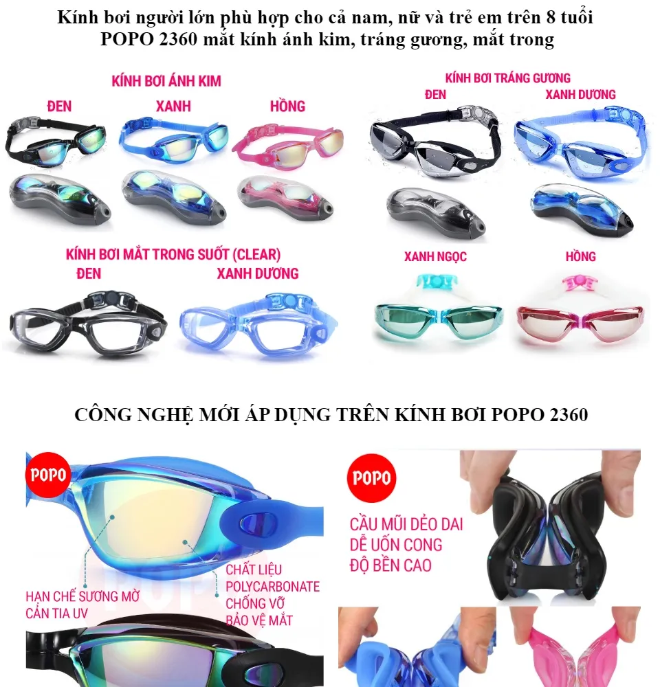 Kính bơi người lớn cho nam, nữ chính hãng POPO 2360 kính bơi tráng gương cao cấp mắt kiếng bơi chống tia UV chống hấp hơi khóa kính bơi thông minh